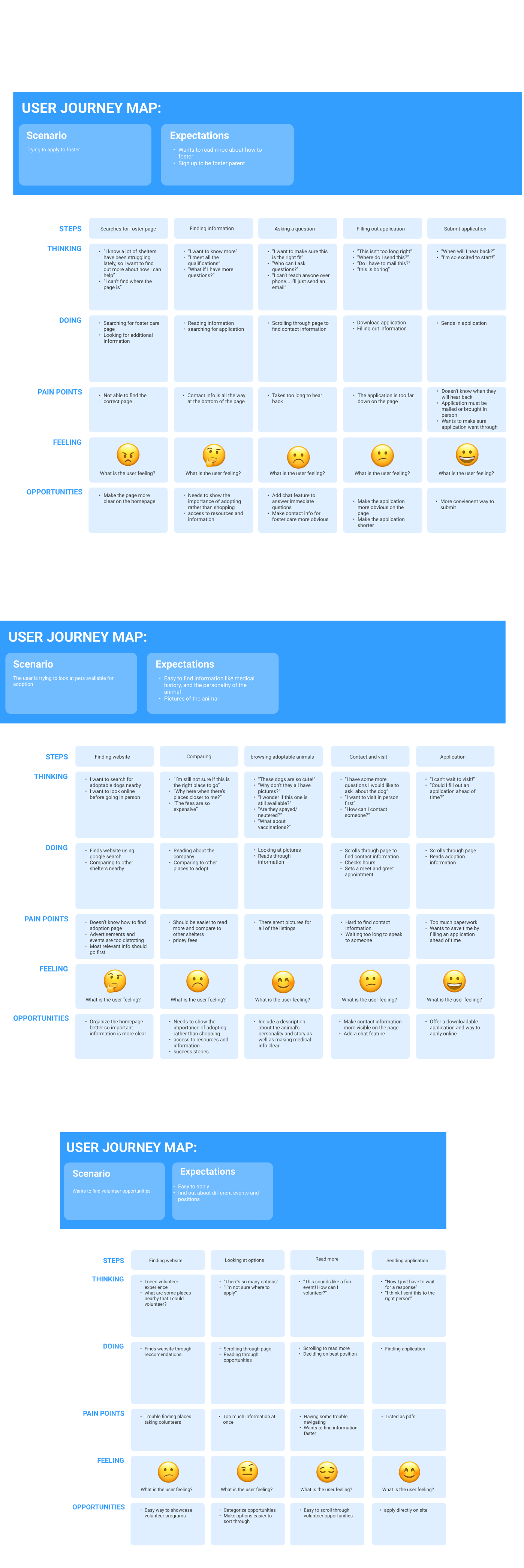My wireframes went through multiple design changes when compared to the final product. Most notably, the filtering features changed to be on the side of the page and the top option was replaced with adoption instructions. This was to make the process more clear as well as the UI more streamlined. Chosen filters were also made more obvious and users are able to switch between multiple different photos easily. The adoption, volunteering, events, and fostering options were also made more obvious on the front page to avoid having to navigate too long to find these options. The fostering page in particular was much harder to find than the others.