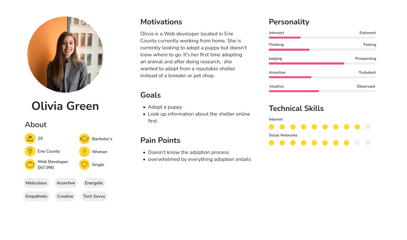 As a part of my Interactivity for the Web class, I redesigned the Erie County SPCA's website. The current website functions fine but it is difficult to find certain pages like fostering information. There is also too much information on one page which can make it overwhelming. On the adoption page, some of the animals also don’t have imagery or descriptions. The goal of this project is a streamlined, well designed website which reduces the amount of information on the page and places donate, volunteer, and adoption buttons front and center